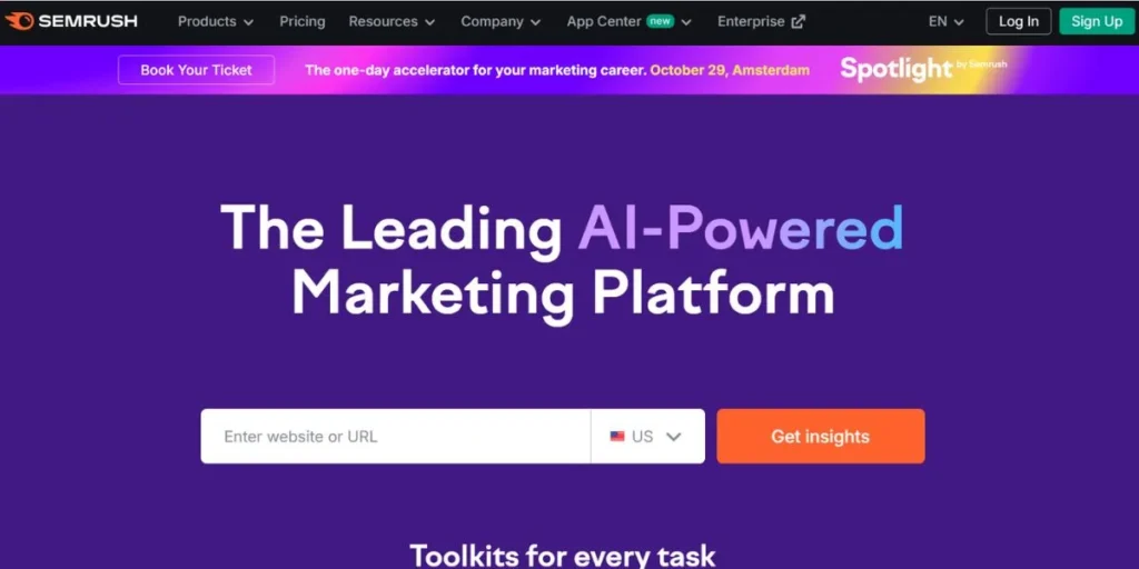 Semrush is a close rival of Ahrefs and a one-stop platform of digital- marketing tools that covers more than just SEO but extends to PPC, social media and content marketing. Its set of tools and bigger database is larger, thus numerous users prefer it to Ahrefs alternatives.