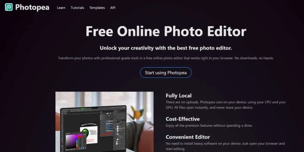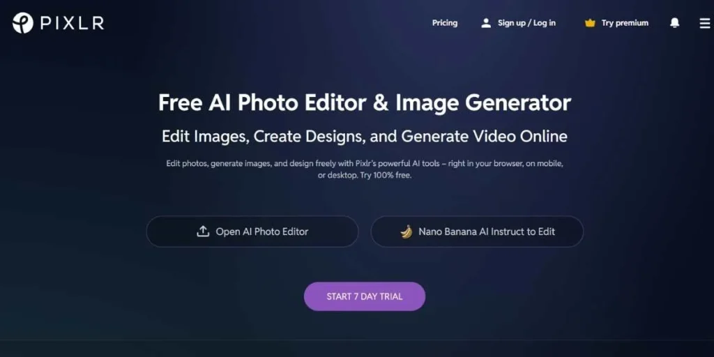Pixlr is a long time player in online editing. It has two applications, Pixlr X (Express) to make simple, fast edits, and Pixlr E (Editor) a more Photoshop-style experience. This flexibility is great. It is browser based and runs on HTML5 which makes it safer and faster compared to the ancient Flash editors. It is a good balance between AI tools and manual controls hence a good middle ground between Canva and Photopea.